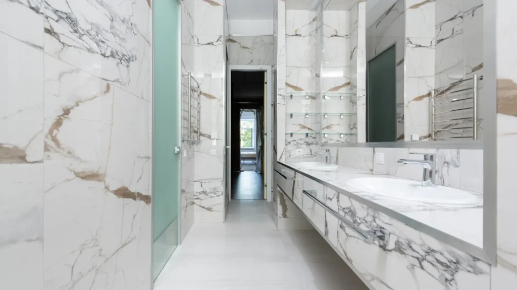 - Moisture-resistant surfaces: Porcelain tiles, stone surfaces, and moisture-resistant wall panels are commonly used because they perform well in humid environments.